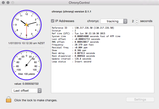 ChronyControl is primarily a front end to the chronyc tool delivered with the chrony software. It can show the overall server performance (tracking) and the state of individual remote time servers